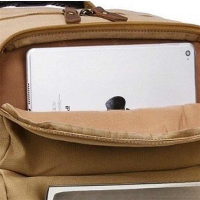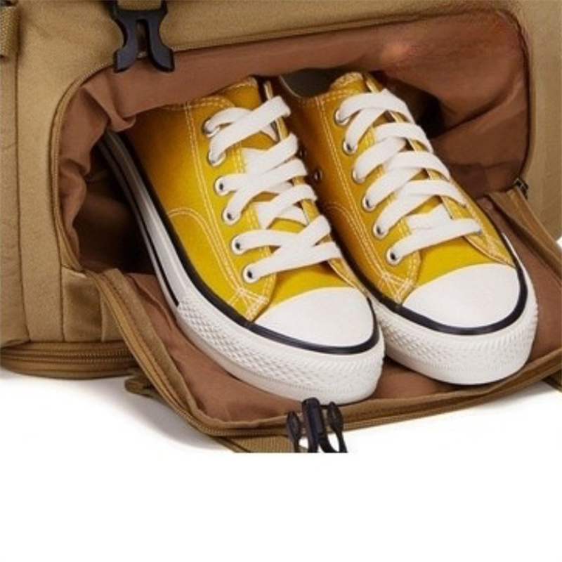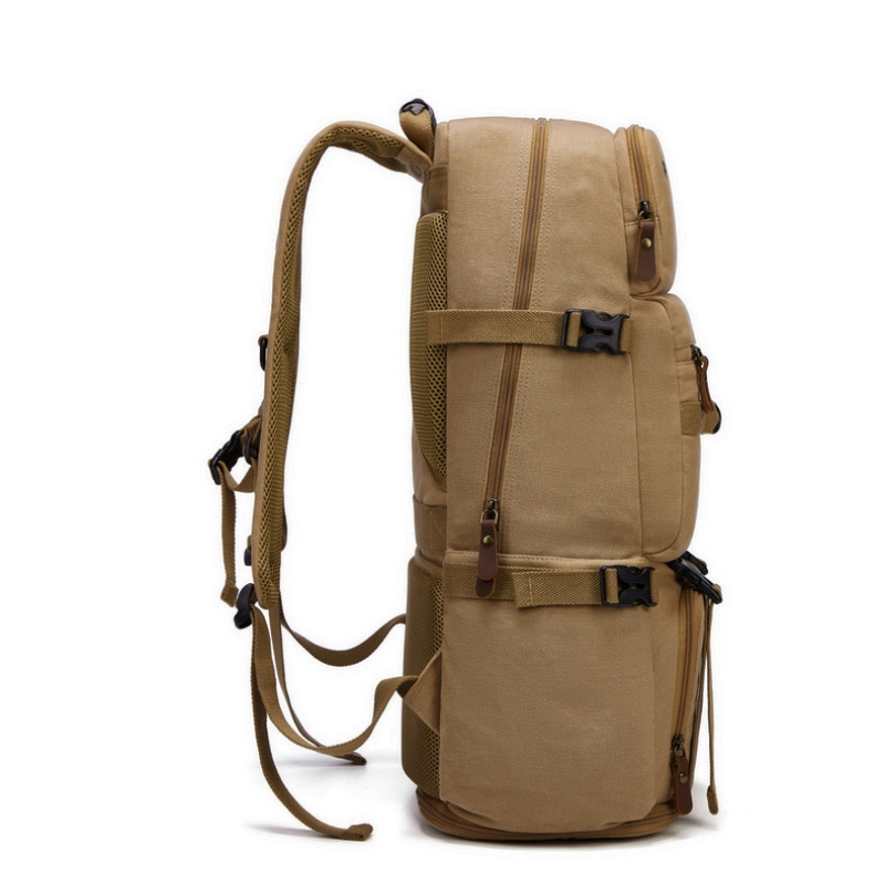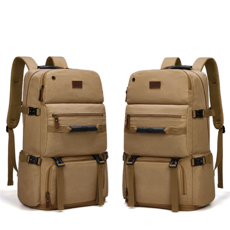 Our mountaineering canvas backpack is renowned for its generous space and expandability, making it ideal for extended trips of up to seven days. It features various compartments, including a dedicated laptop compartment, zippered mesh pockets, and even meets the requirements for carry-on luggage.