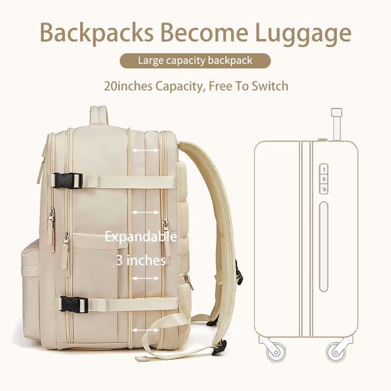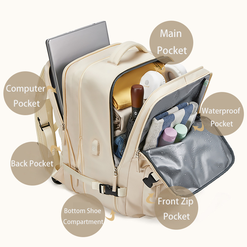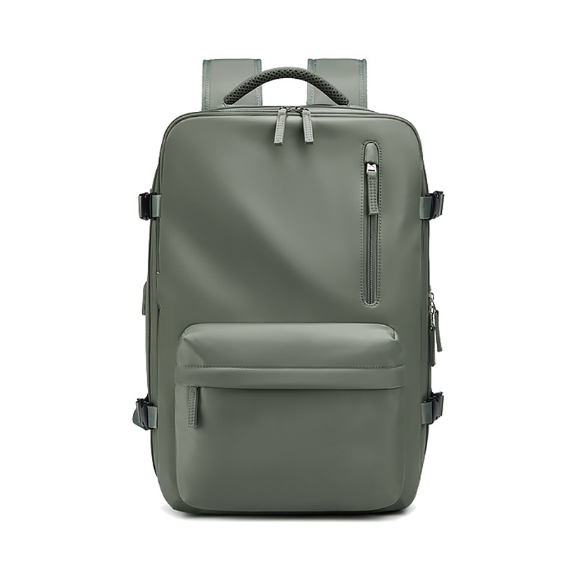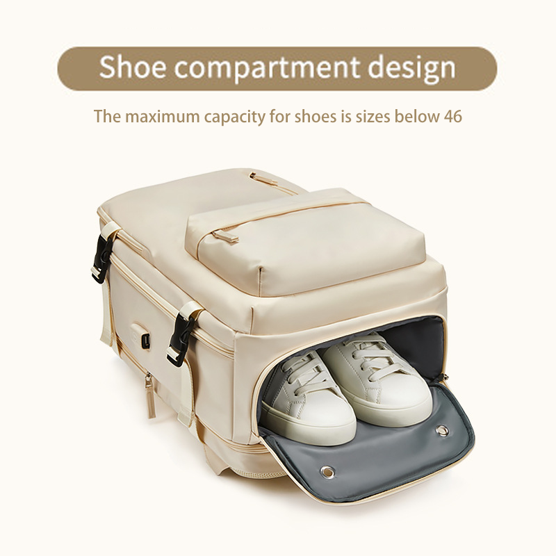 Stay organized with the thoughtful design of our backpack. It features a dedicated shoe compartment, allowing you to separate your shoes from other items. The expandable main compartment offers flexibility in packing, and the specialized laptop compartment provides a secure and padded space for your electronic devices. With a built-in USB charging port, you can conveniently charge your devices on the go, keeping you connected throughout your journey. The wet/dry separation design helps you keep your belongings organized and protects them from moisture.