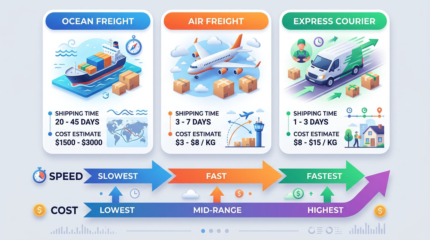Sea Freight: The cheapest option for large orders (20ft/40ft containers). Transit time is 20-45 days, and costs start at $1,500-$3,000 per container.