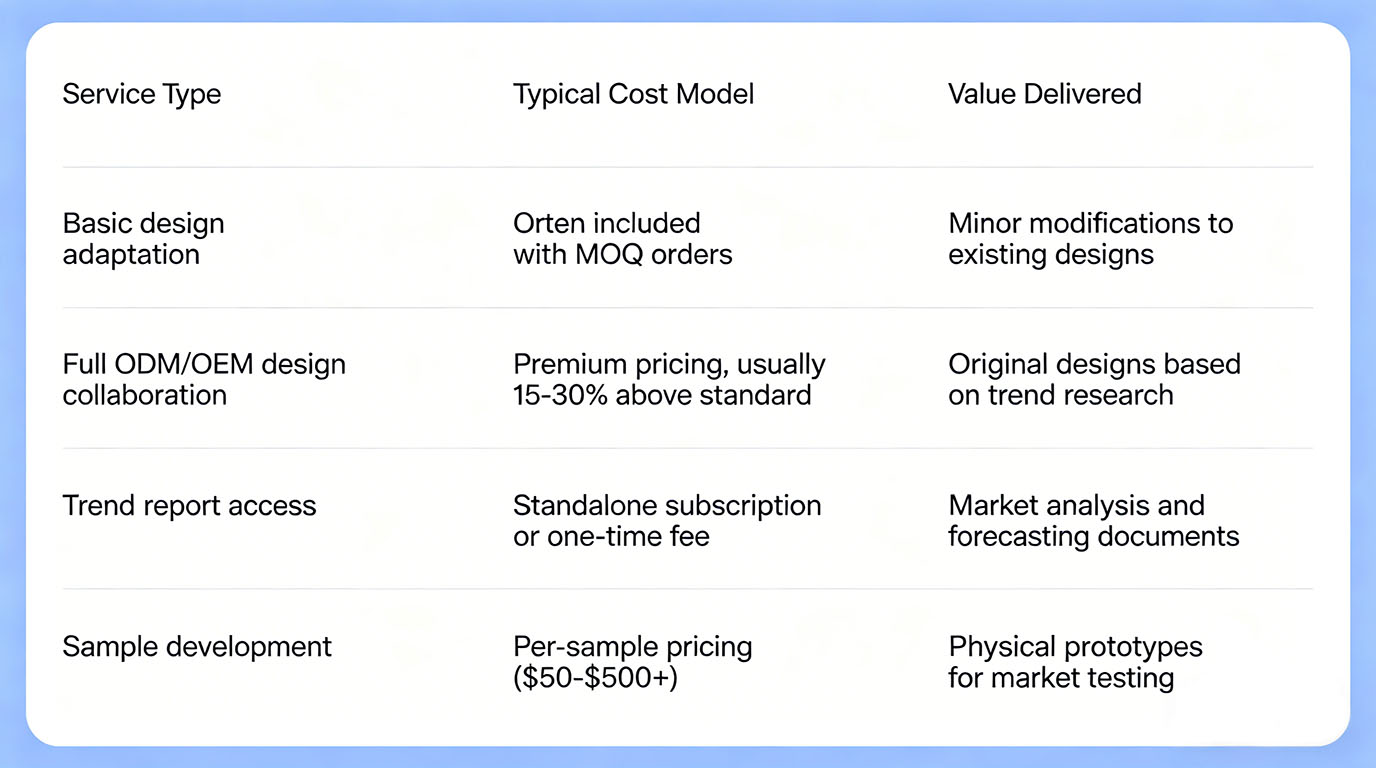 Product development and trend consultation services are typically offered as paid add-ons rather than complimentary offerings. This is an important budget consideration for small businesses.
