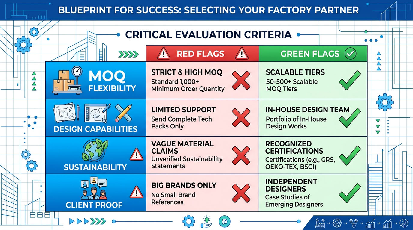 | Design Capability | “Send finished tech packs” | “In-house design team portfolio” |