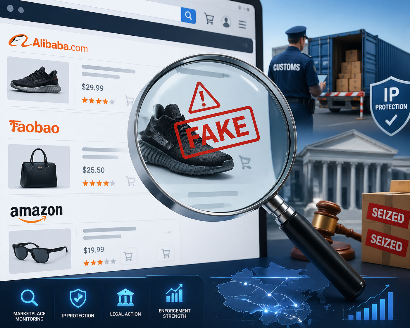 Automated Tools: Use services like Red Points to scan Alibaba, Taobao, and Amazon for counterfeits.