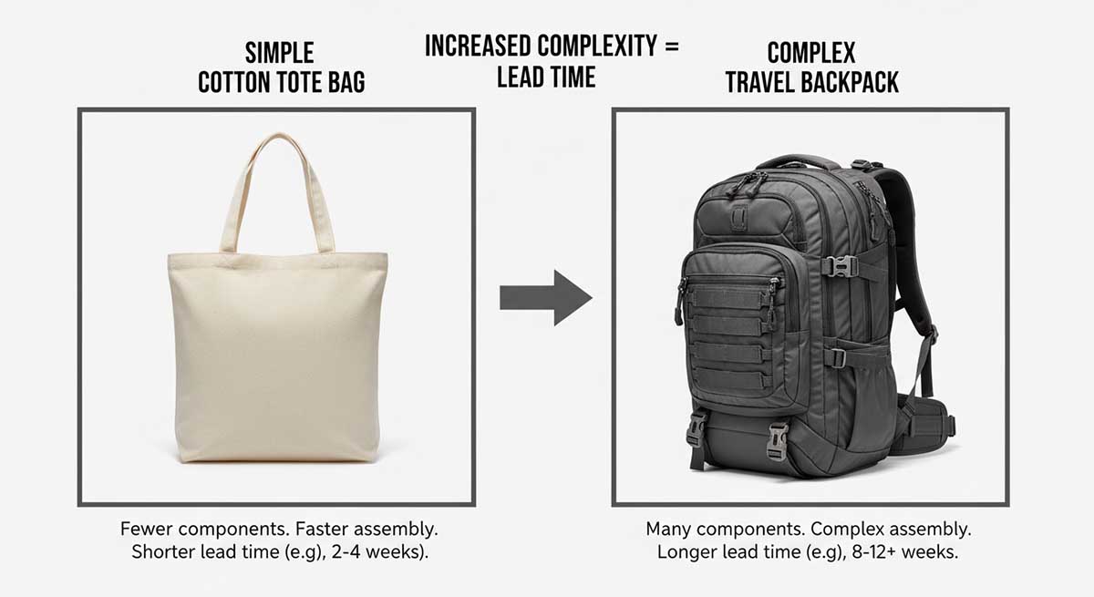 Complex Bags (Structured Bags, Backpacks, Custom Hardware):* Easily require 12-16+ weeks, especially for large volumes (>10,000 units) or unique materials.