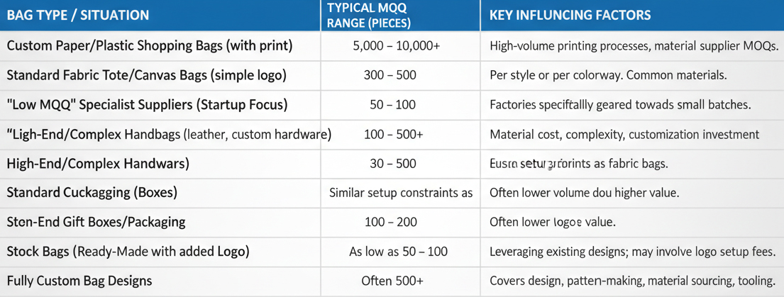 MOQs vary dramatically based on the bag type, materials used, level of customization, and the specific factory’s capabilities. Here’s a breakdown based on aggregated industry data: