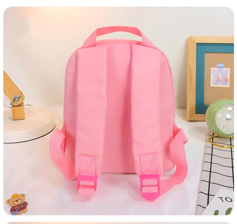 This children’s bag is designed for children aged 3-8 years old. The size of the bag is about 26*21*6cm, which is very suitable for the small body of the child, neither too large nor bulky. Nylon  is used on the material, which has good softness, but also very lightweight, the overall weight does not exceed 300 grams, reducing the burden on the child.