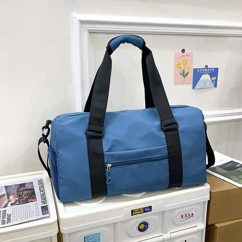 Chiroyli dizayn:Zamonaviy ko'k rang silliq qora tasmalar bilan uyg'unlashib, sizning sport uslubingizni to'ldiradigan vizual jozibali sumkani yaratadi.